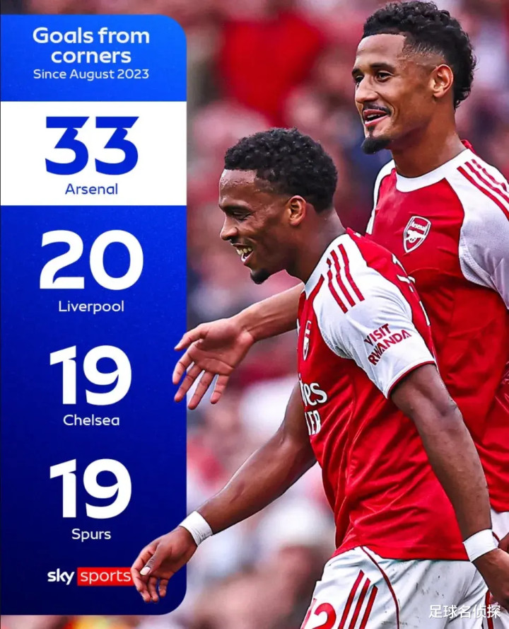 自从2023年8月以来,阿森纳已经通过角球打进33球,比其他英超球队至少多13个。